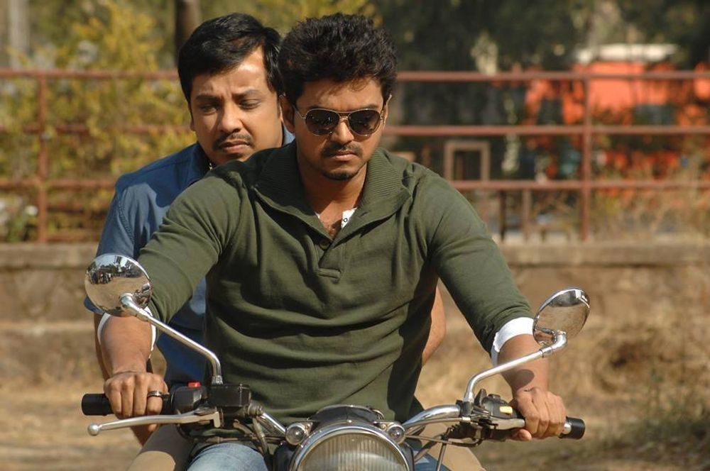Vijay and Kajal Aggarwal having dispute on the road, where Vijay is sitting on a bike and after that Kajal leaves in an auto rickshaw showing that she stole the Key of the motorbike. But in the scenes before, she is not making any attempt to take the key and while she leaves the key is inserted in the motorbike itself.